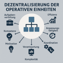 Die Dezentralisierung operativer Einheiten ist ein Organisationsprinzip, bei dem Entscheidungsbefugnisse und operative Aufgaben von einer zentralen Leitungsebene auf untergeordnete Einheiten übertragen werden. Diese Einheiten können entweder geografisch verteilt oder funktional spezialisiert sein, etwa auf Bereiche wie Vertrieb oder Controlling. Ziel dieser Struktur ist es, die Effizienz, Reaktionsgeschwindigkeit und Anpassungsfähigkeit einer Organisation zu verbessern. Gleichzeitig soll die Eigenverantwortung der Mitarbeitenden gestärkt werden, was wiederum ihre Motivation und Identifikation mit dem Unternehmen fördern kann.